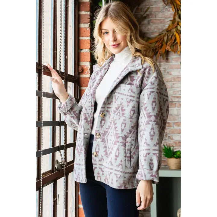 -Imported -Aztec pattern thick woven -Relaxed fit shirts jacket -High collar neck -Reglan shoulder line -Chest pockets -Button up closure Handwash Cold 100% Polyester Model is 5'8" and wearing size Small